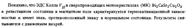Показано, что ЭДС Холла в сверхпроводящих монокристаллах (МК) Bi2CaSr2Cu2Ox в резистивном состоянии в магнитном поле характеризуется термоактивационной зависимостью и имеет знак, противоположный знаку в нормальном состоянии. Результаты связываются с движением вихрей.