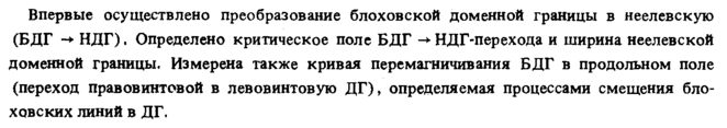 Впервые осуществлено преобразование блоховской доменной границы в неелевскую (БДГ -+· НДГ). Определено критическое поле БДГ НДГ-перехода и ширина неелевской доменной границы. Измерена также кривая перемагничивания БДГ в продольном поле (переход правовинтовой в левовинтовую ДГ), определяемая процессами смещения блоховских линий в ДГ.