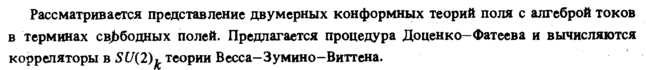 Рассматривается представление двумерных конформных теорий поля с алгеброй токов в терминах свободных полей. Предлагается процедура Доценко-Фатеева и вычисляются корреляторы в SU(2)i теории Весса-Зумино-Виттена.