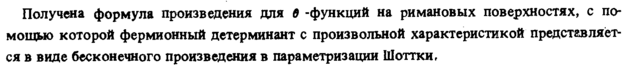 Получена формула произведения для в -функций на римановых поверхностях, с помощью которой фермионный детерминант с произвольной характеристикой представляется в виде бесконечного произведения в параметризации Шоттки,