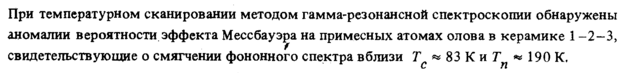 При температурном сканировании методом гамма-резонансной спектроскопии обнаружены аномалии вероятности эффекта Мессбауэра на примесных атомах олова в керамике 1-2-3, свидетельствующие о смягчении фононного спектра вблизи Τ 83 К и Г «190 К,