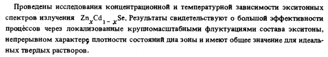 Проведены исследования концентрационной и температурной зависимости экситонных спектров излучения Zn Cd Se. Результаты свидетельствуют о большой эффективности процессов через локализованные крупномасштабными флуктуациями состава экситоны, непрерывном характере, плотности состояний дна зоны и имеют общее значение для идеальных твердых растворов.