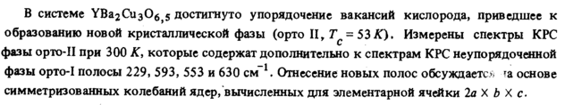 В системе YBa2Cu306 5 достигнуто упорядочение вакансий кислорода, приведшее к образованию новой кристаллической фазы (орто II, Τ = 53 ΛΓ)Измерены спектры КРС фазы орто-И при 300 К, которые содержат дополнительно к спектрам КРС неупорядоченной фазы ορτο-I полосы 229, 593, 553 и 630 см 1. Отнесение новых полос обсуждается m основе сим метризованных колебаний ядер, вычисленных для элементарной ячейки 2а X b X с.