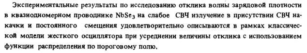 Экспериментальные результаты по исследованию отклика волны зарядовой плотности в квазиодномерном проводнике NbSe3 на слабое СВЧ излучение в присутствии СВЧ накачки и постоянного смещения удовлетворительно описываются в рамках классической модели жесткого осциллятора при усреднении величины отклика с использованием функции распределения по пороговому полю.