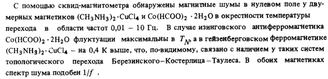 С помощью сквид-магнитометра обнаружены магнитные шумы в нулевом поле у двумерных магнетиков (CH3NH3)2-СиСЦ и Со(НСОО)2 · 2Н2 О в окрестности температуры перехода в области частот 0,01 10 Гц, В случае изинговского антиферромагнетика Со(НСОО)2 * 2Н20 флуктуации максимальны в ΤΝ, а в гейзенберговском ферромагнетике (СНзШз)2-€иСЦ на 0,4 К выше, что, по-видимому, связано с наличием у таких систем топологического перехода Березинекого-Костерлица-Таулеса, В обоих магнетиках спектр шума подобен 1// ,
