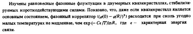 Изучены равновесные фазонные флуктуации в двумерных квазикристаллах, стабилизируемых короткодействующими силами. Показано, что, даже если квазикристалл является основным состоянием, фазонный коррелятор ((^(0) v(R))*) расходится при сколь угодно малых температурах не медленнее, чем ехр (Ce/T)]xiRf где е характерная энергия связи.