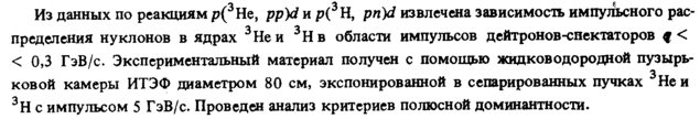 Из данных по реакциям р(3Не, pp)d и р(3Н, pn)d извлечена зависимость импульсного распределения нуклонов в ядрах 3Неи 3Нв области импульсов дейтронов-снектаторов f < < 0,3 ГэВ/с, Экспериментальный материал получен с помощью жидководородной пузырь-ков ой камеры ИТЭФ диаметром 80 см, экспонированной в сепарированных пучках Не и 3Н с импульсом 5 ГэВ/с. Проведен анализ критериев полюсной доминантности.