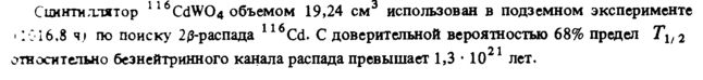 Сиинтнллятор 116CdW04 объемом 19,24 см3 использован в подземном эксперименте -1016.8 ч) по поиску 20-распада 116Cd. С доверительной вероятностью 68% предел F1/2 относительно безнейтринного канала распада превышает 1,3 · 1021 лет.
