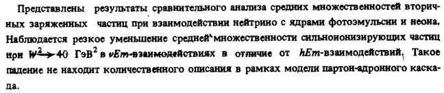 Представлены результаты сравнительного анализа средних множеств енностей вторичных заряженных частиц при взаимодействии нейтрино с ядрами фотоэмульсии и неона. Наблюдается резкое уменьшение средней1 множественности сильноионизирующих частиц ври W2 > 40 ГэВ2 в *£>»-вэаимод*йствиях в отличие от Ши-взаимодействий, Такое падение не находит количественного описания в рамках модели партон-адронного каскада.