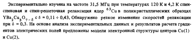 Экспериментально изучена на частоте 31,5 МГц при температурах 120 К и 4,2 К спин-спиновая и спин-решеточная релаксация ядер 63Сив поликристаллических образцах YBa2Cu30?_§ с δ = 0,11-г 0,43, Обнаружено резкое изменение скоростей релаксации при 6 = 0,3, На основе анализа экспериментальных данных и результатов расчета градиентов электрических полей предложены модели электронной структуры центров Си(1) и Си(2).
