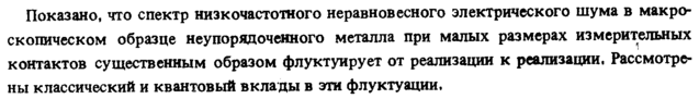 Показано, что спектр низкочастотного неравновесного электрического шума в макроскопическом образце неупорядоченного металла при малых размерах измерительных контактов существенным образом флуктуирует от реализации к реализации. Рассмотрены классический и квантовый вклады в эти флуктуации,