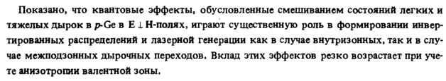 Показано, что квантовые эффекты, обусловленные смешиванием состояний легких и тяжелых дырок в p-Ge в El Н-полях, играют существенную роль в формировании инвертированных распределений и лазерной генерации как в случае внутризонных, так и в случае межподзонных дырочных переходов. Вклад этих эффектов резко возрастает при учете анизотропии валентной зоны.