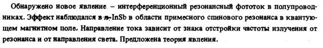 Обнаружено новое явление интерференционный резонансный фототок в полупроводниках. Эффект наблюдался в ffc-InSb в области примесного спинового резонанса в квантующем магнитном поле. Направление тока зависит от знака отстройки частоты излучения от резонанса и от направления света. Предложена теория явления.