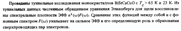 Проведены туннельные исследования монокристаллов BiSrCaCuO с ^ -65 К и 23 К. Из туннельных данных численным обращением уравнения Элиашберга для щели восстановлены спектральные плотности ЭФВ a2(u>)F(u). (^равнение этих функций между собой и с фо-нонным спектром F(cj) указывает на сильное ЭФВ и его определяющую роль в образовании сверхпроводящих пар электронов.
