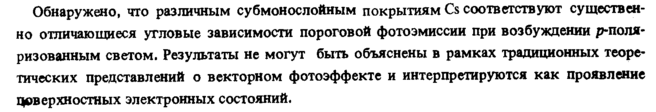 Обнаружено, что различным субмонослойным покрытиям Cs соответствуют существенно отличающиеся угловые зависимости пороговой фотоэмиссии при возбуждении р-поля-ризованным светом. Результаты не могут быть объяснены в рамках традиционных теоретических представлений о векторном фотоэффекте и интерпретируются как проявление Поверхностных электронных состояний.