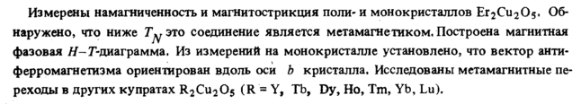 Измерены намагниченность и магнитострикция полии монокристаллов ЕГ2С112О5, Обнаружено, что ниже это соединение является метамагнетиком. Построена магнитная фазовая Н-Г-диаграмма, Из измерений на монокристалле установлено, что вектор анти-ферромагнетизма ориентирован вдоль оси Ъ кристалла. Исследованы метамагнитные переходы в других купратах R2Cu205 (R'= Y, Tb, Dy, Ho, Tm, Yb, Lu).