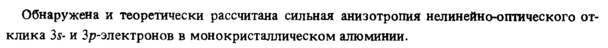 Обнаружена и теоретически рассчитана сильная анизотропия нелинейно-оптического отклика 3sи Зр-электронов в монокристаллическом алюминии.