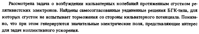 Рассмотрена задача о возбуждении кильватерных колебаний протяженным сгустком релятивистских электронов. Найдены самосогласованные уединенные решения БГК-типа, для которых сгусток не испытывает торможения со стороны кильватерного потенциала. Показано, что при этом генерируются значительные электрические поля, представляющие интерес для задач коллективного ускорения.