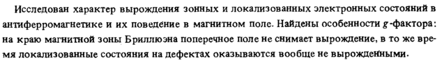 Исследован характер вырождения зонных и локализованных электронных состояний в антиферромагнетике и их поведение в магнитном поле. Найдены особенности #-фактора: на краю магнитной зоны Бриллюэна поперечное поле не снимает вырождение, в то же время локализованные состояния на дефектах оказываются вообще не вырожденными.
