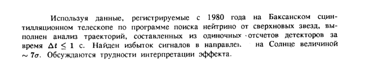 Используя данные, регистрируемые с 1980 года на Баксанском сцин-тилляционном телескопе по программе поиска нейтрино от сверхновых звезд, выполнен анализ траекторий, составленных из одиночных отсчетов детекторов за время Δί < 1 с. Найден избыток сигналов в направлеь на Солнце величиной ~ 7σ. Обсуждаются трудности интерпретации эффекта.
