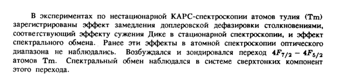 В экспериментах по нестационарной КАРОспектроскопии атомов тулия (Тт) зарегистрированы эффект замедления доплеровской дефазировки столкновениями, соответствующий эффекту сужения Дике в стационарной спектроскопии, и эффект спектрального обмена. Ранее эти эффекты в атомной спектроскопии оптического диапазона не наблюдались. Возбуждался и зондировался переход 4F7/2 4F5/2 атомов Тт. Спектральный обмен наблюдался в системе сверхтонких компонент этого перехода.