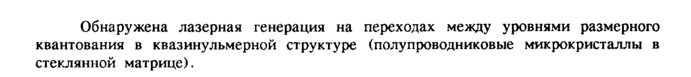 Обнаружена лазерная генерация на переходах между уровнями размерного квантования в квазинульмерной структуре (полупроводниковые микрокристаллы в стеклянной матрице).