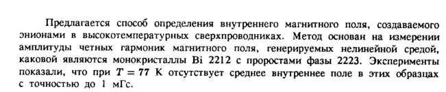 Предлагается способ определения внутреннего магнитного поля, создаваемого анионами в высокотемпературных сверхпроводниках. Метод основан на измерении амплитуды четных гармоник магнитного поля, генерируемых нелинейной средой, каковой являются монокристаллы Bi 2212 с проростами фазы 2223. Эксперименты показали, что при Τ = 77 К отсутствует среднее внутреннее поле в этих образцах с точностью до 1 мГс.