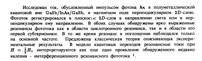 Исследован ток, обусловленный импульсом фотона Ьк в полу металлической квантовой яме GaSb/InAs/GaSb, в магнитном поле перпендикулярном 2Л-слою. Фототок регистрировался в плоскоои 2Г)-слоя в направлении света или в перпендикулярном ему направлении. В обоих случаях обнаружены ярко выраженные резонансы фототока как в области циклотронного резонанса, так и в области его первой субгармоники. В то же время резонанс в поглощении наблюдался только на основной частоте. Предложена классическая теория описывающая экспериментальные результаты. В модели квантовых переходов резонансные токи при Η = J Нс интерпретируются как еще одно проявление обнаруженного недавно явления интерференционного резонансного фототока 1.