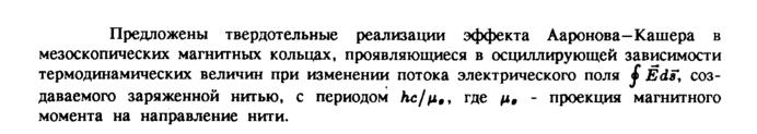 Предложены твердотельные реализации эффекта Ааронова-Кашера в мезоскопических магнитных кольцах, проявляющиеся в осциллирующей зависимости термодинамических величин при изменении потока электрического поля f Eda, создаваемого заряженной нитью, с периодом hc/μ,, где μ, проекция магнитного момента на направление нити.