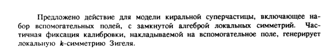 Предложено действие для модели киральной суперчастицы, включающее набор вспомогательных полей, с замкнутой алгеброй локальных симметрии. Частичная фиксация калибровки, накладываемой на вспомогательное поле, генерирует локальную jfc-симметрию Зигеля.