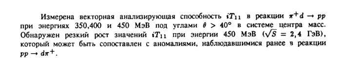 Измерена векторная анализирующая способность хТц в реакции x+d —♦ рр при энергиях 350,400 и 450 МэВ под углами θ > 40° в системе центра масс. Обнаружен резкий рост значений %Тц при энергии 450 МэВ {y/S = 2,4 ГэВ), который может быть сопоставлен с аномалиями, наблюдавшимися ранее в реакции рр —> άπ~*~.