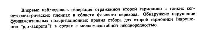 Впервые наблюдалась генерация отраженной второй гармоники в тонких сег-нетоэлектрических пленках в области фазового перехода. Обнаружено нарушение фундаментальных поляризационных правил отбора для второй гармоники (нарушение "р, «-запрета") в средах с мелкомасштабной неоднородностью.