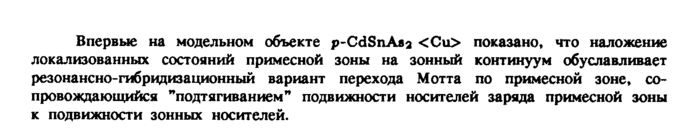 Впервые на модельном объекте p-CdSnAea <Cu> показано, что наложение локализованных состояний примесной зоны на зонный континуум обуславливает резонансно-гибридизационный вариант перехода Мотта по примесной зоне, сопровождающийся "подтягиванием" подвижности носителей заряда примесной зоны к подвижности зонных носителей.