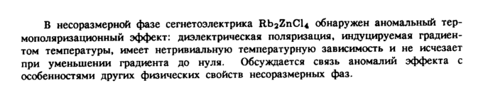 В несоразмерной фазе сегнетоэлектрика Rb3ZnCU обнаружен аномальный термополяризационный эффект: диэлектрическая поляризация, индуцируемая градиентом температуры, имеет нетривиальную температурную зависимость и не исчезает при уменьшении градиента до нуля. Обсуждается связь аномалий эффекта с особенностями других физических свойств несоразмерных фаз.