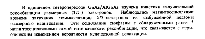 В одиночном гетеропереходе GaAs/AlGaAs изучена кинетика излучательной рекомбинации двумерных (2D-) электронов. Наблюдались магнитоосцилляции времени затухания люминесценции 2 D-электронов из возбужденной подзоны размерного квантования. Эти осцилляции синфазны с обнаруженными ранее 4 магнитоосцилляциями самой интенсивности рекомбинации, что связывается с периодическим изменением вероятности межподзонной релаксации.