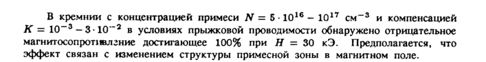 В кремнии с концентрацией примеси N = 5 · Ю16 1017 см"3 и компенсацией К 1°_3 3 10"~2 в условиях прыжковой проводимости обнаружено отрицательное магнитосопротивлзние достигающее 100% при Я = 30 кЭ. Предполагается, что эффект связан с изменением структуры примесной зоны в магнитном поле.