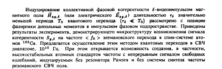 Индуцирование коллективной фазовой когерентности ί-видеоимпульсом магнитного поля Hzfts (или электрического Elytf) длительностью г* значительно меньшей периода То квантового перехода (т$ < Т0) рассмотрено с позиции фазировки дипольных моментов в импульсном фазовом подпространстве. Приведены результаты эксперимента, демонстрирующего микроструктуру возникновения сигнала когерентности SVts на частоте < /о > зеемановского перехода в спин-системе атомов lssCs. Предлагается осуществление этим методом квантовых переходов в СВЧ диапазоне, 1010 Гц. При этом открывается возможность создания, в частности, высокостабильных атомных стандартов частоты с непрерывным сигналом свободных колебаний, индуцируемым без резонатора Рамзея и без системы синтеза частоты резонансного СВЧ поля.