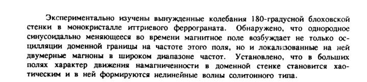 Экспериментально изучены вынужденные колебания 180-градусной блоховской стенки в монокристалле иттриевого феррограната. Обнаружено, что однородное синусоидально меняющееся во времени магнитное поле возбуждает не только осцилляции доменной границы на частоте этого поля, но и локализованные на ней двумерные магноны в широком диапазоне частот. Установлено, что в больших полях характер движения намагниченности в доменной стенке становится хаотическим и в ней формируются нелинейные волны солитонного типа.