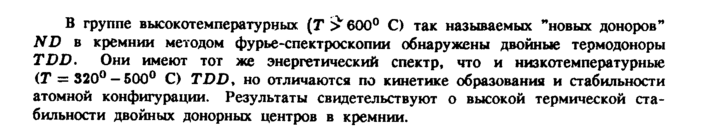 В группе высокотемпературных (Г :> 600° С) так называемых "новых доноров" ND в кремнии методом фурье-спектроскопии обнаружены двойные термодоноры TDD. Они имеют тот же энергетический спектр, что и низкотемпературные (Г = 320° — 500° С) TDD, но отличаются по кинетике образования и стабильности атомной конфигурации. Результаты свидетельствуют о высокой термической стабильности двойных донорных центров в кремнии.