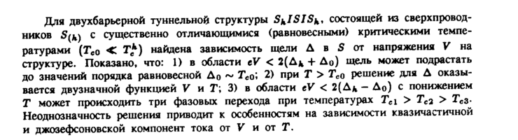 Для двухбарьерной туннельной структуры SkISISk, состоящей из сверхпроводников с существенно отличающимися (равновесными) критическими температурами (Ге0 < Т£) найдена зависимость щели Δ в 5 от напряжения V на структуре. Показано, что: 1) в области eV < 2(Ад + Δο) щель может подрастать до значений порядка равновесной Δ0 ~ Гс0; 2) при Г > Тс0 решение для Δ оказывается двузначной функцией V и Г; 3) в области eV < 2(Δ* Δο) с понижением Τ может происходить три фазовых перехода при температурах Те\ > Гсз > Гсз-Неоднозначность решения приводит к особенностям на зависимости квазичастичной и джозефсоновской компонент тока от V и от Т.