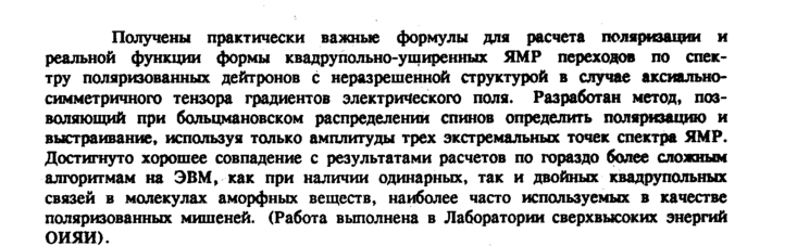 Получены практически важные формулы для расчета поляризации и реальной функции формы квадрупольно-ущиренных ЯМ Ρ переходов по спектру поляризованных дейтронов с неразрешенной структурой в случае аксиально-симметричного тензора градиентов электрического поля. Разработан метод, позволяющий при больцмановском распределении спинов определить поляризацию и выстраивание, используя только амплитуды трех экстремальных точек спектра ЯМР. Достигнуто хорошее совпадение с результатами расчетов по гораздо более сложным алгоритмам на ЭВМ, как при наличии одинарных, так и двойных квадрупольных связей в молекулах аморфных веществ, наиболее часто используемых в качестве поляризованных мишеней. (Работа выполнена в Лаборатории сверхвысоких энергий ОИЯИ).