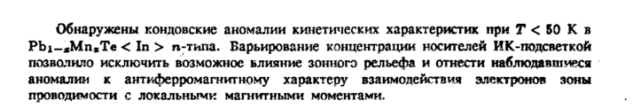 Обнаружены кондовские аномалии кинетических характеристик при Τ < 50 К в Pbi-,Μη,Τβ < In > га-типа. Варьирование концентрации носителей ИК-подсветкой позволило исключить возможное влияние зонного рельефа и отнести наблюдавшиеся аномалии к антиферромагнитному характеру взаимодействия электронов зоны проводимости с локальными магнитными моментами.