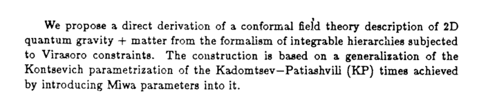 We propose a direct derivation of a conformal field theory description of 2D quantum gravity + matter from the formalism of integrable hierarchies subjected to Virasoro constraints. The construction is based on a generalization of the Kontsevich parametrization of the Kadomtsev-Patiashvili (KP) times achieved by introducing Miwa parameters into it.