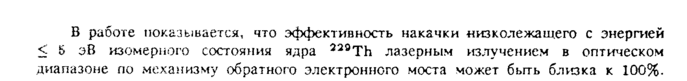 В работе показывается, что эффективность накачки «изколежащего с энергией < 5 эВ изомерного состояния ядра 223Th лазерным излучением в оптическом диапазоне по механизму обратного электронного моста может быть близка к 100%.