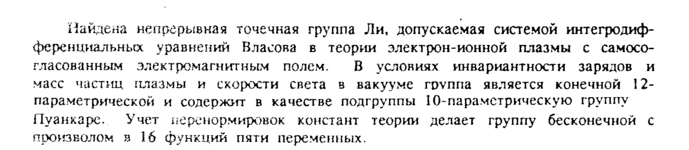 Найдена непрерывная точечная группа Ли, допускаемая системой интегродиф-ференциальных уравнений Власова в теории электрон-ионной плазмы с самосогласованным электромагнитным полем. В условиях инвариантности зарядов и масс частиц плазмы и скорости света в вакууме группа является конечной 12-параметрической и содержит в качестве подгруппы 10-парамстрическую группу Пуанкаре. Учет перенормировок констант теории делает группу бесконечной с произволом в 16 функций пяти переменных.