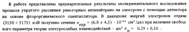 В работе представлены предварительные результаты экспериментального исследования процесса упругого рассеяния реакторных антинейтрино на электроне с помощью детектора на основе фторорганического сцинтиллятора. В диапазоне энергий электронов отдачи (3150 5175) кэВ получено сечение о = (6,8 ± 4,5) · 10~46 см2/дел при величине свобод- СЛ LJ ного параметра теории электрослабых взаимодействий sin2 θ = 0,29 ± 0,10 .