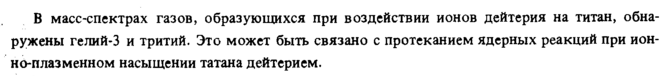 В масс-спектрах газов, образующихся при воздействии ионов дейтерия на титан, обнаружены гелий-3 и тритий. Это может быть связано с протеканием ядерных реакций при ион-но-плазменном насыщении татана дейтерием.