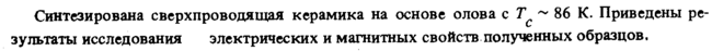 Синтезирована сверхпроводящая керамика на основе олова с Τ' ~ 86 К. Приведены ре-зультаты исследования электрических и магнитных свойств полученных образцов.