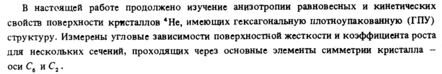 В настоящей работе продолжено изучение анизотропии равновесных и кинетических свойств поверхности кристаллов 4Не, имеющих гексагональную плотноупакованную (ГПУ) структуру. Измерены угловые зависимости поверхностной жесткости и коэффициента роста для нескольких сечений, проходящих через основные элементы симметрии кристалла — оси С6 и С2.