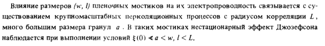 Влияние размеров (w, I) пленочных мостиков на их электропроводность связывается с существованием крупномасштабных перколяционных процессов с радиусом корреляции L, много большим размера гранул а . В таких мостиках нестационарный эффект Джозефсона наблюдается при выполнении условий £(0) < а < w, I < L,